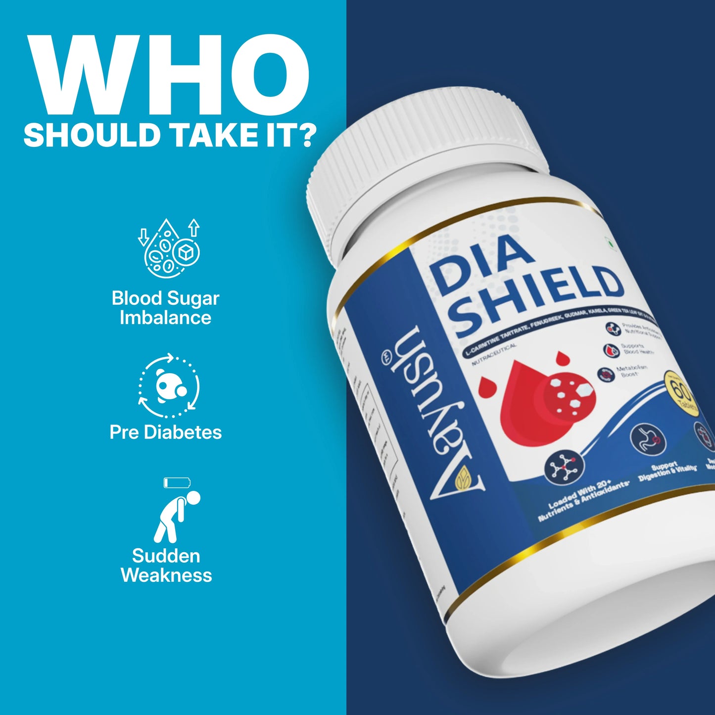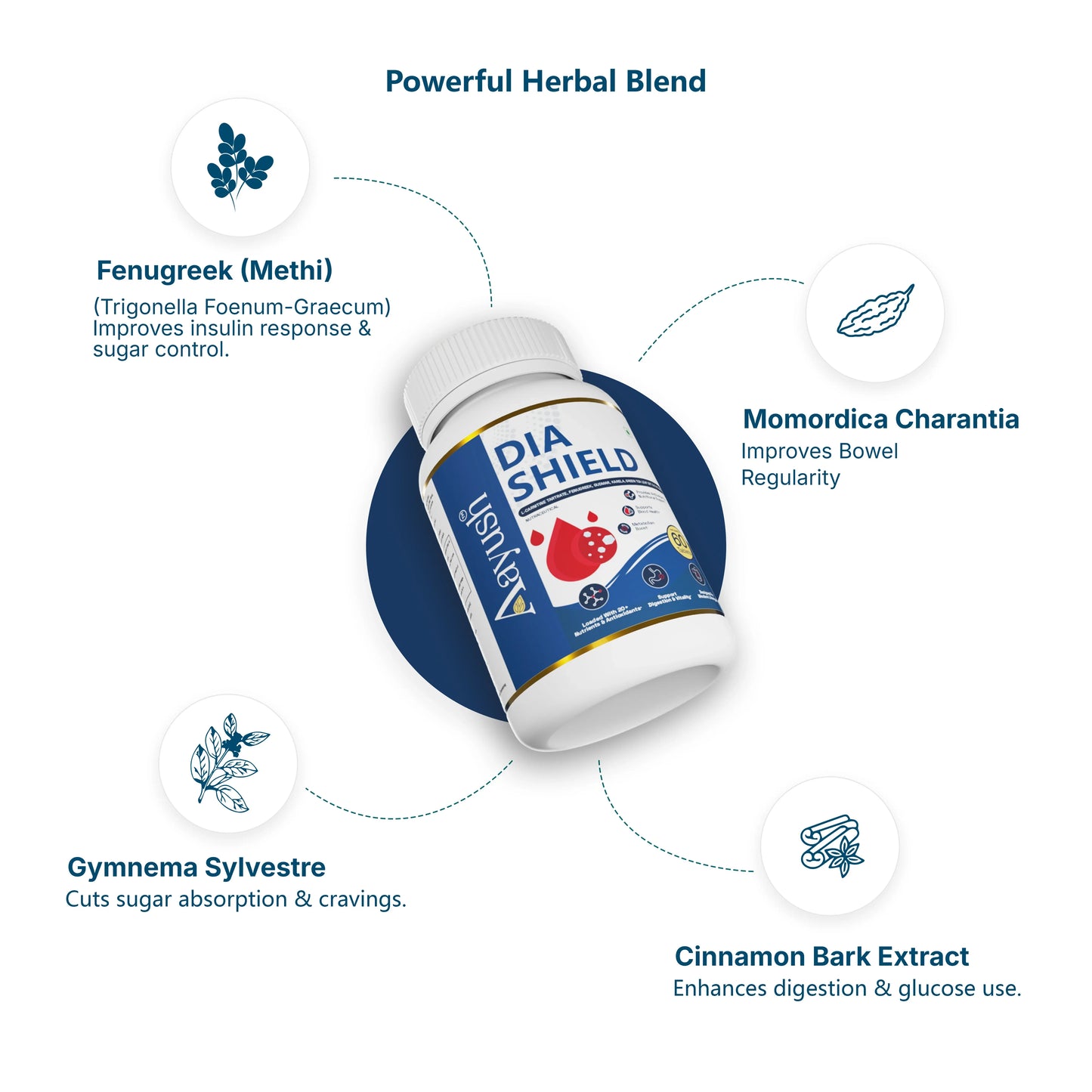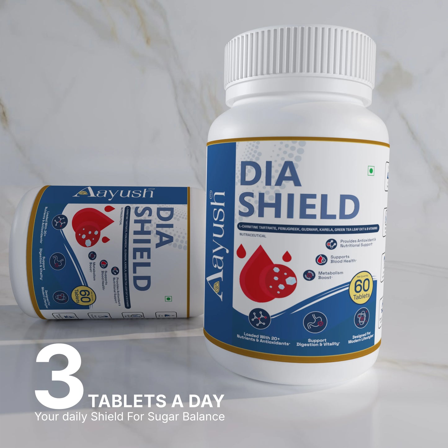 Aayush Wellness Dia Shield Tablets are a scientifically formulated nutraceutical inspired by the principles of Ayurveda and supported by modern science to help maintain healthy blood sugar levels and metabolic balance. Made with ingredients like Fenugreek Extract, Gudmar, Karela, Cinnamon, and Green Tea Extract, the formula combines traditional herbal wisdom with clinically studied nutrients. These antioxidant and metabolic-supporting compounds help support glucose metabolism, improve energy utilization, and promote overall wellness. The blend also helps support digestion and daily vitality. Suitable for daily use when taken as directed