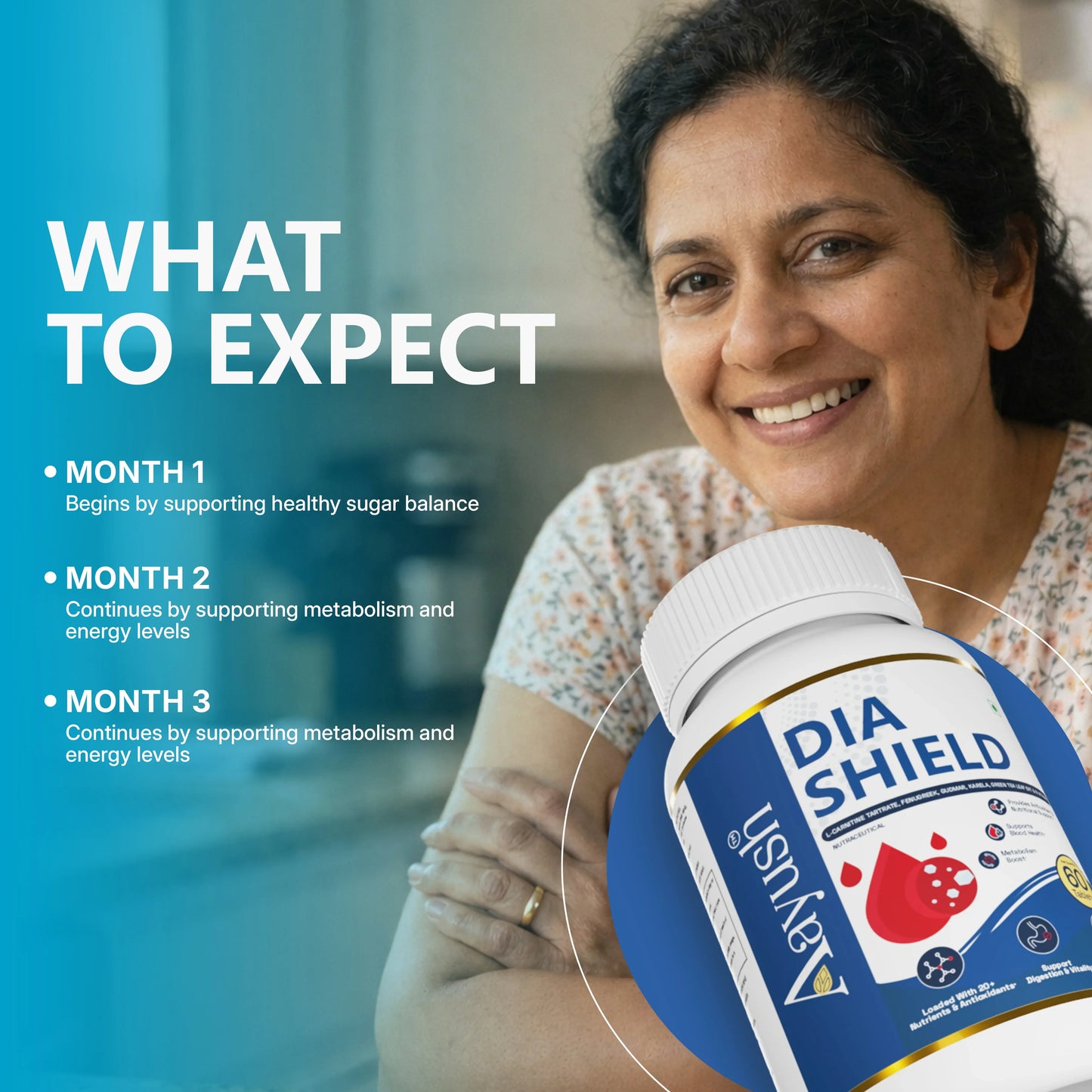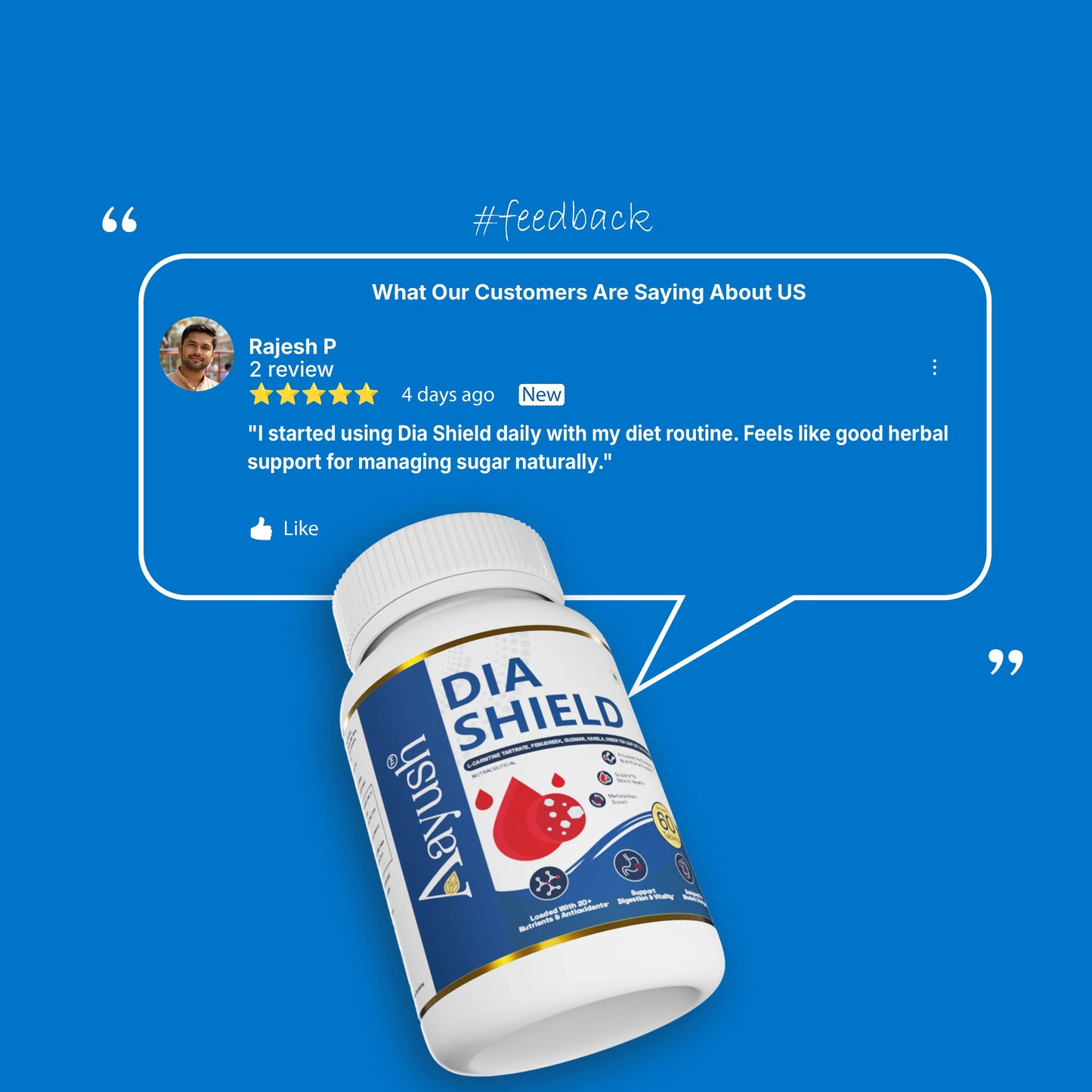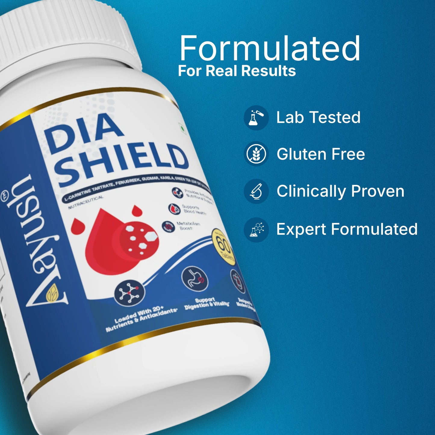 Aayush Wellness Dia Shield Tablets are a scientifically formulated nutraceutical inspired by the principles of Ayurveda and supported by modern science to help maintain healthy blood sugar levels and metabolic balance. Made with ingredients like Fenugreek Extract, Gudmar, Karela, Cinnamon, and Green Tea Extract, the formula combines traditional herbal wisdom with clinically studied nutrients. These antioxidant and metabolic-supporting compounds help support glucose metabolism, improve energy utilization, and promote overall wellness. The blend also helps support digestion and daily vitality. Suitable for daily use when taken as directed