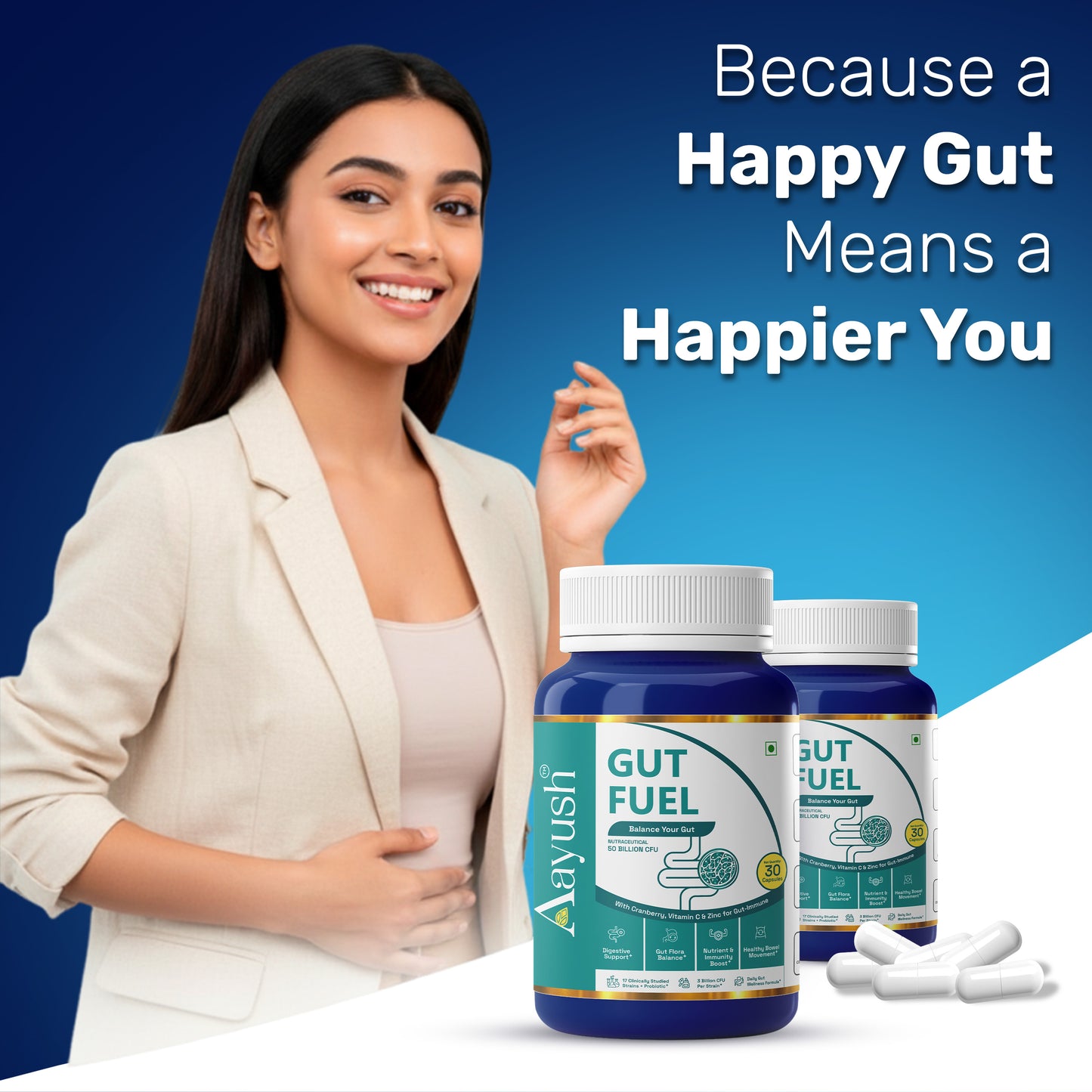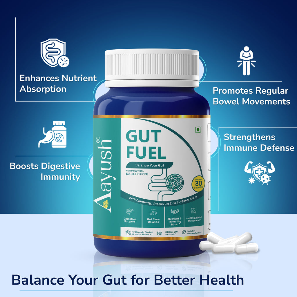 Aayush Gut Fuel Capsules are daily probiotic‑prebiotic supplements with 50 Billion CFU from 17 clinically studied strains, plus FOS, Vitamin C, Zinc, and Cranberry. They are designed to balance gut flora, improve digestion, and strengthen gut‑immune health.