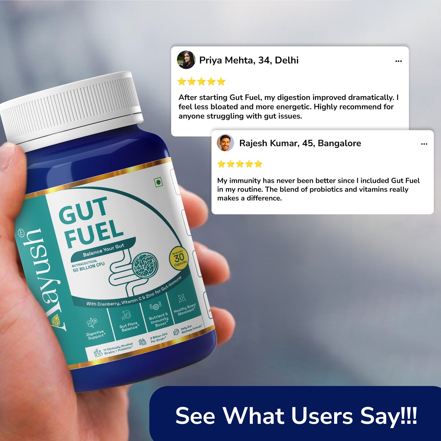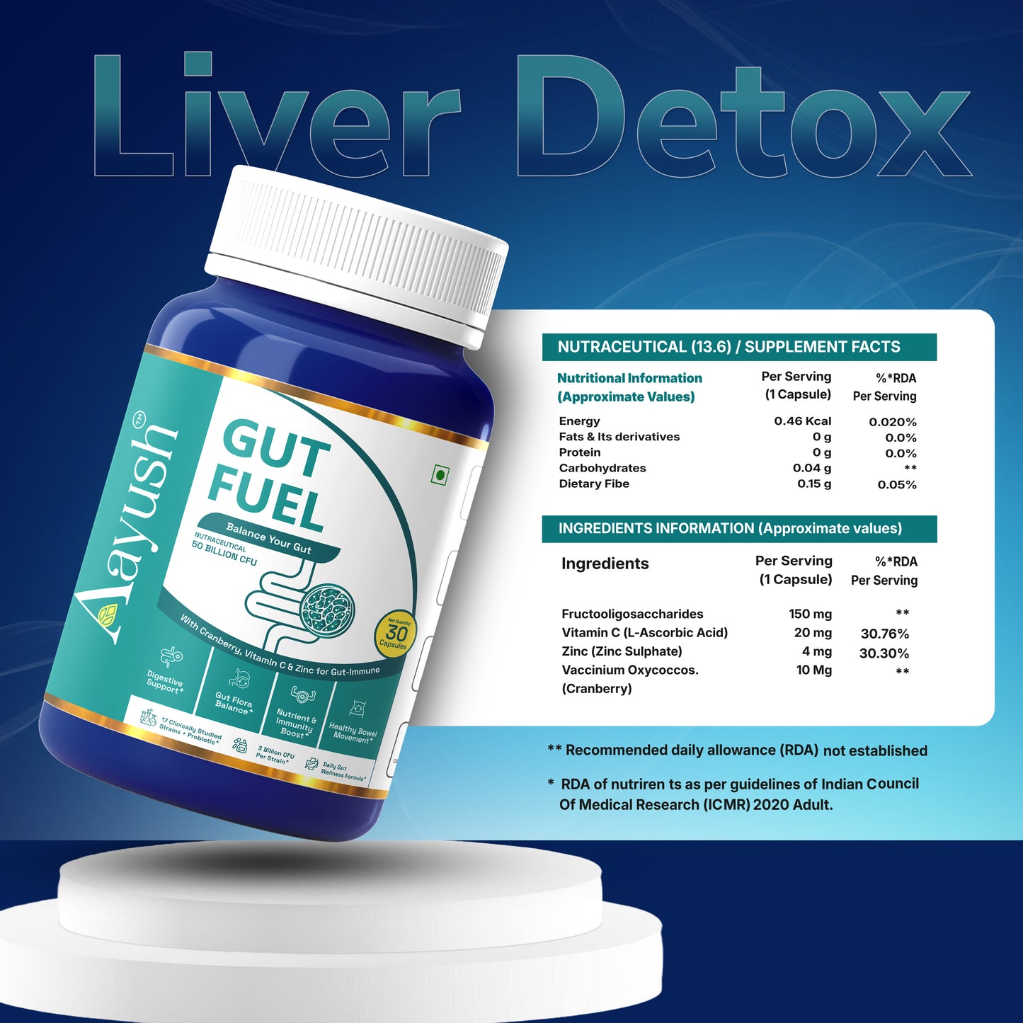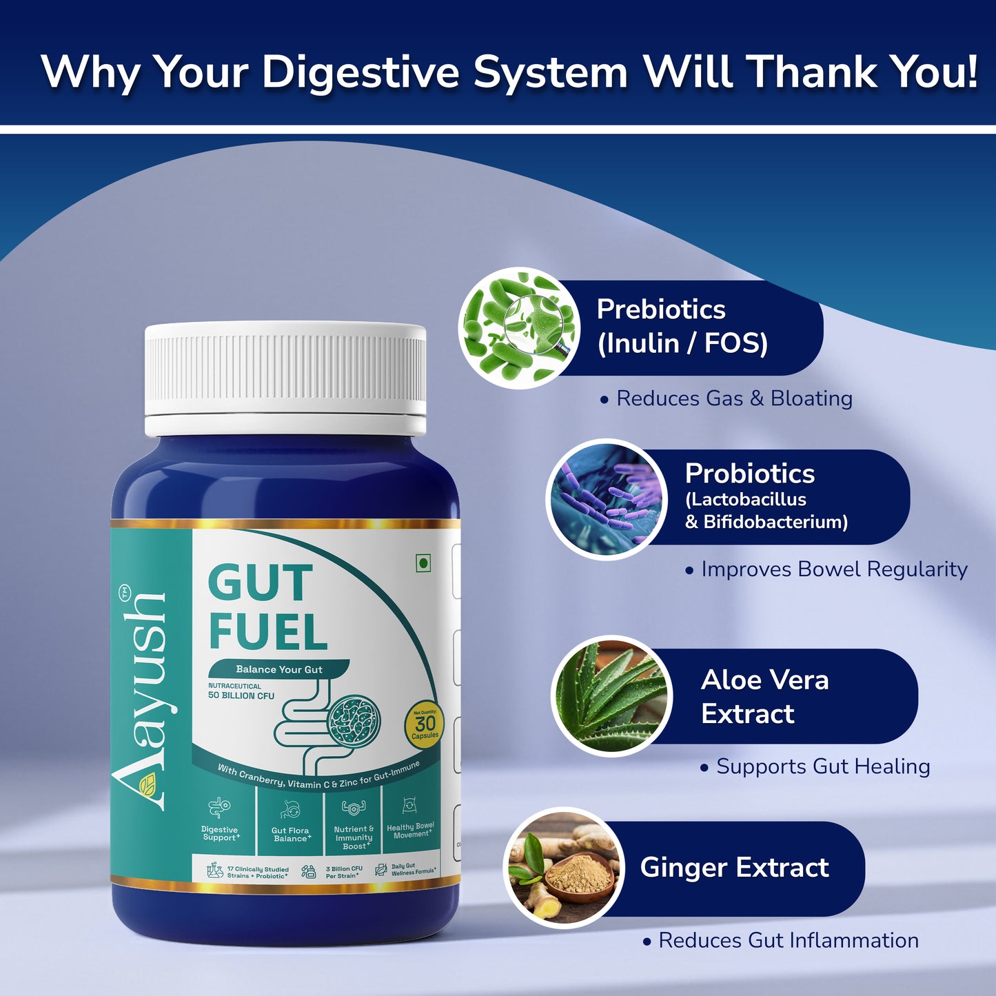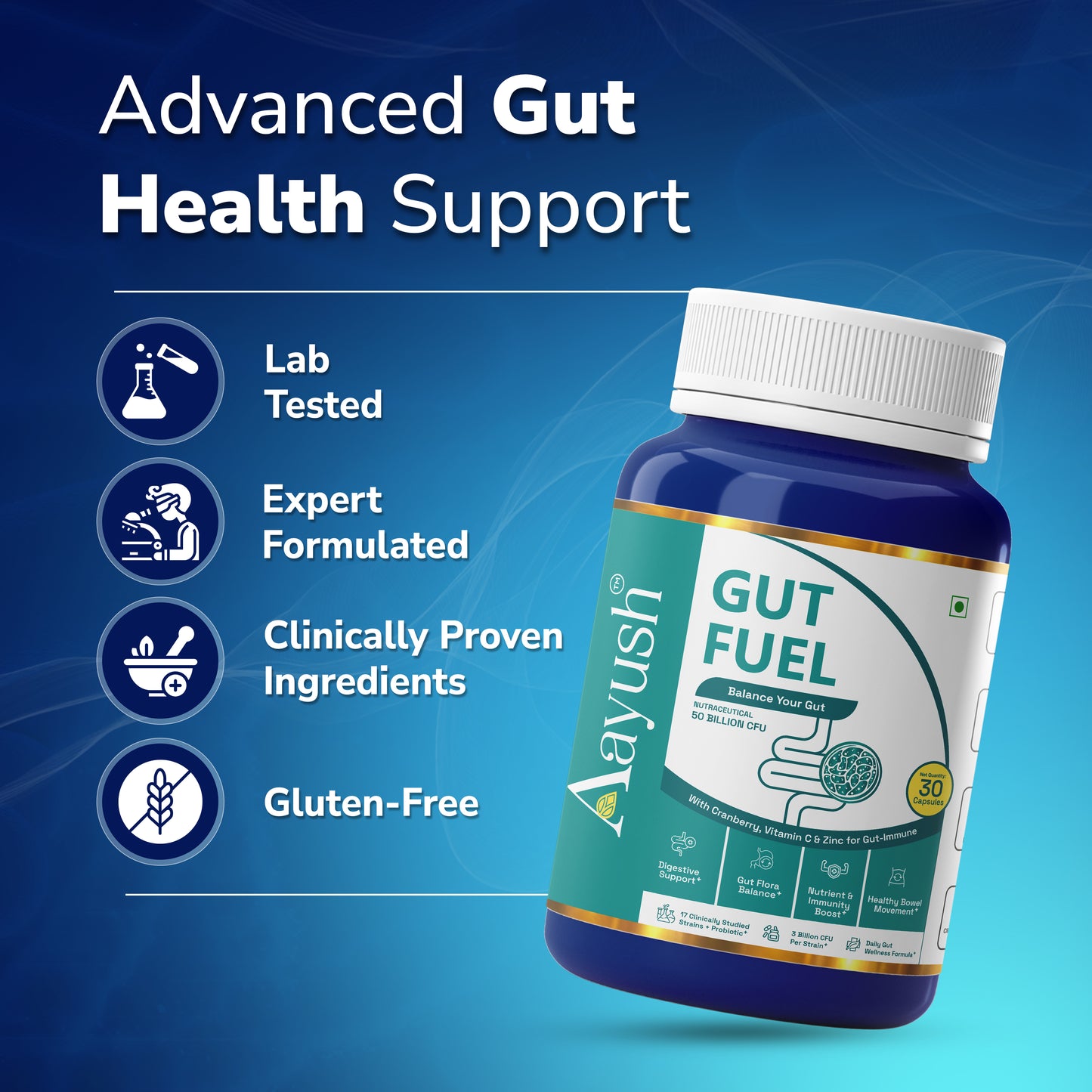 Aayush Gut Fuel Capsules are daily probiotic‑prebiotic supplements with 50 Billion CFU from 17 clinically studied strains, plus FOS, Vitamin C, Zinc, and Cranberry to support digestion, gut flora balance, and immunity.