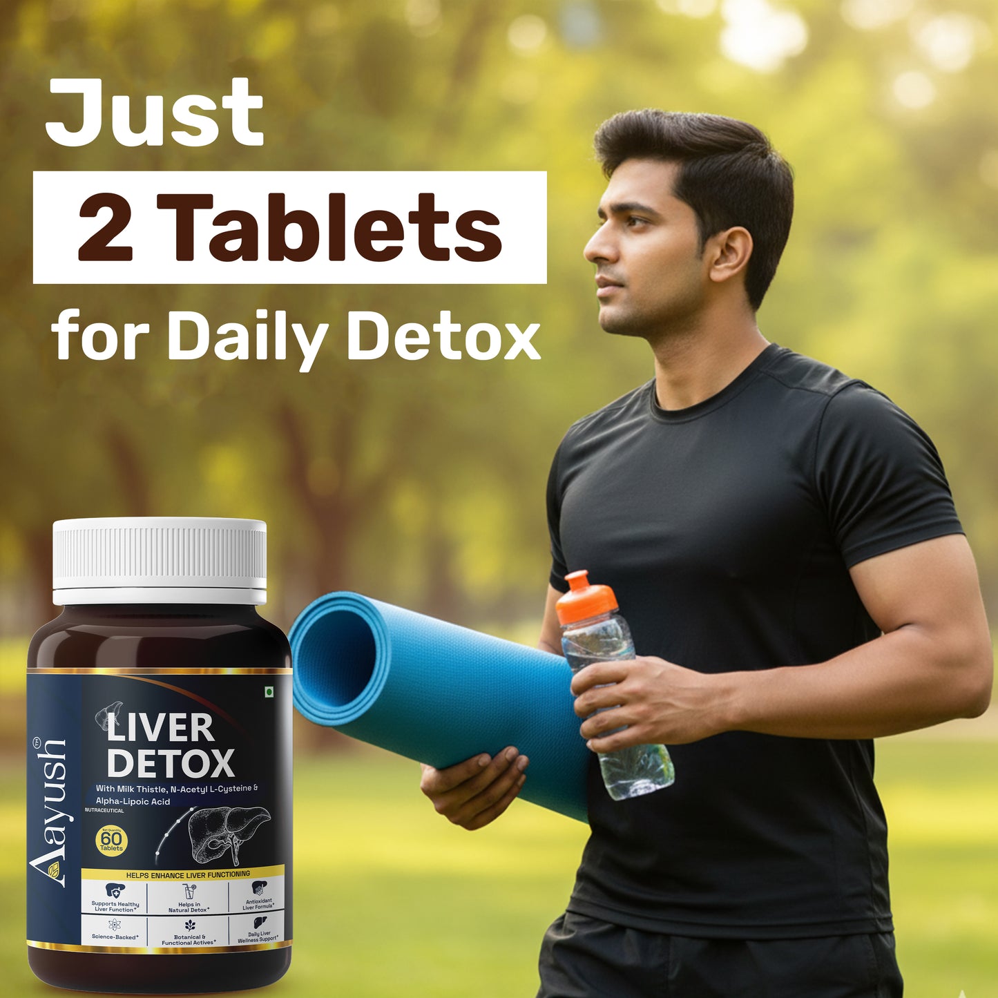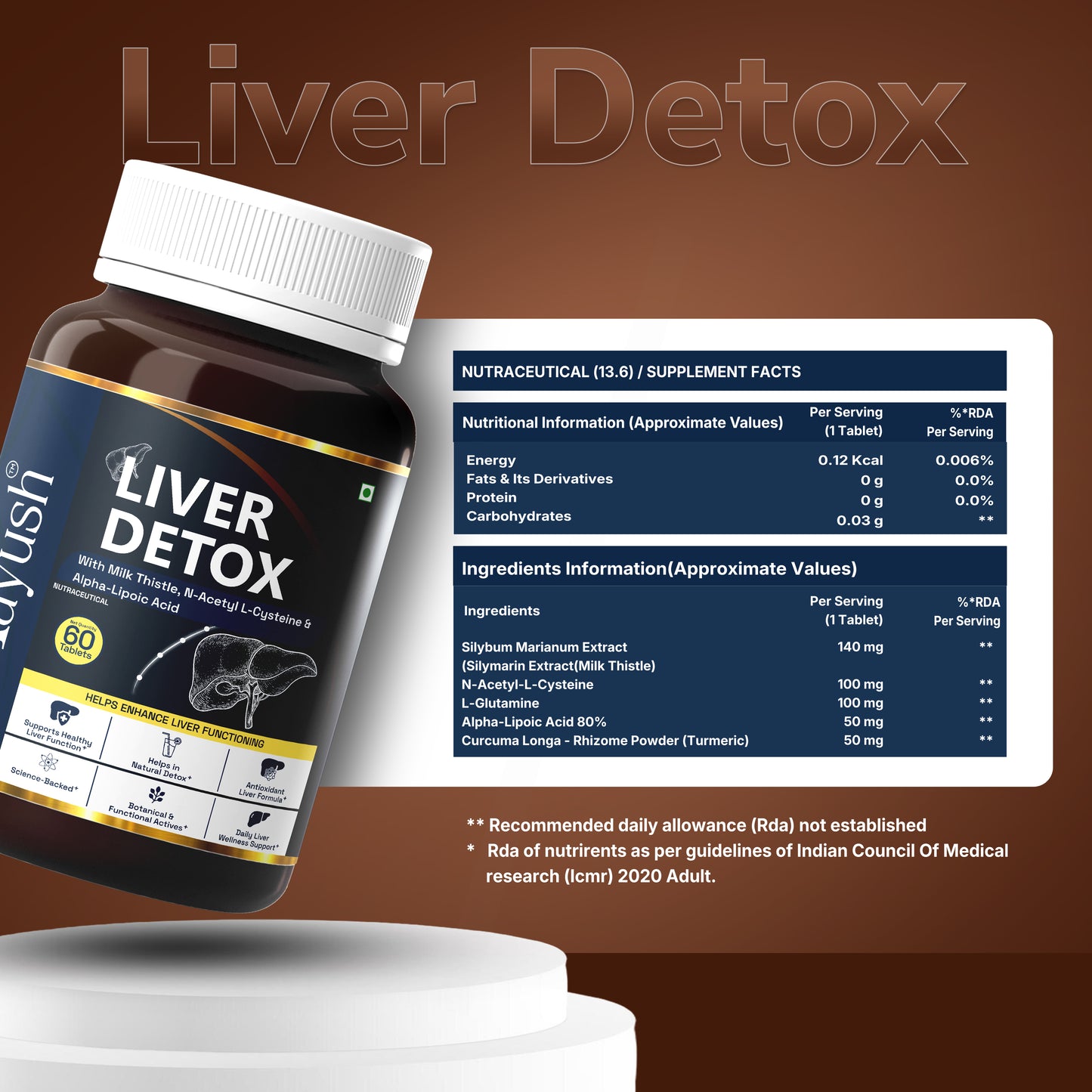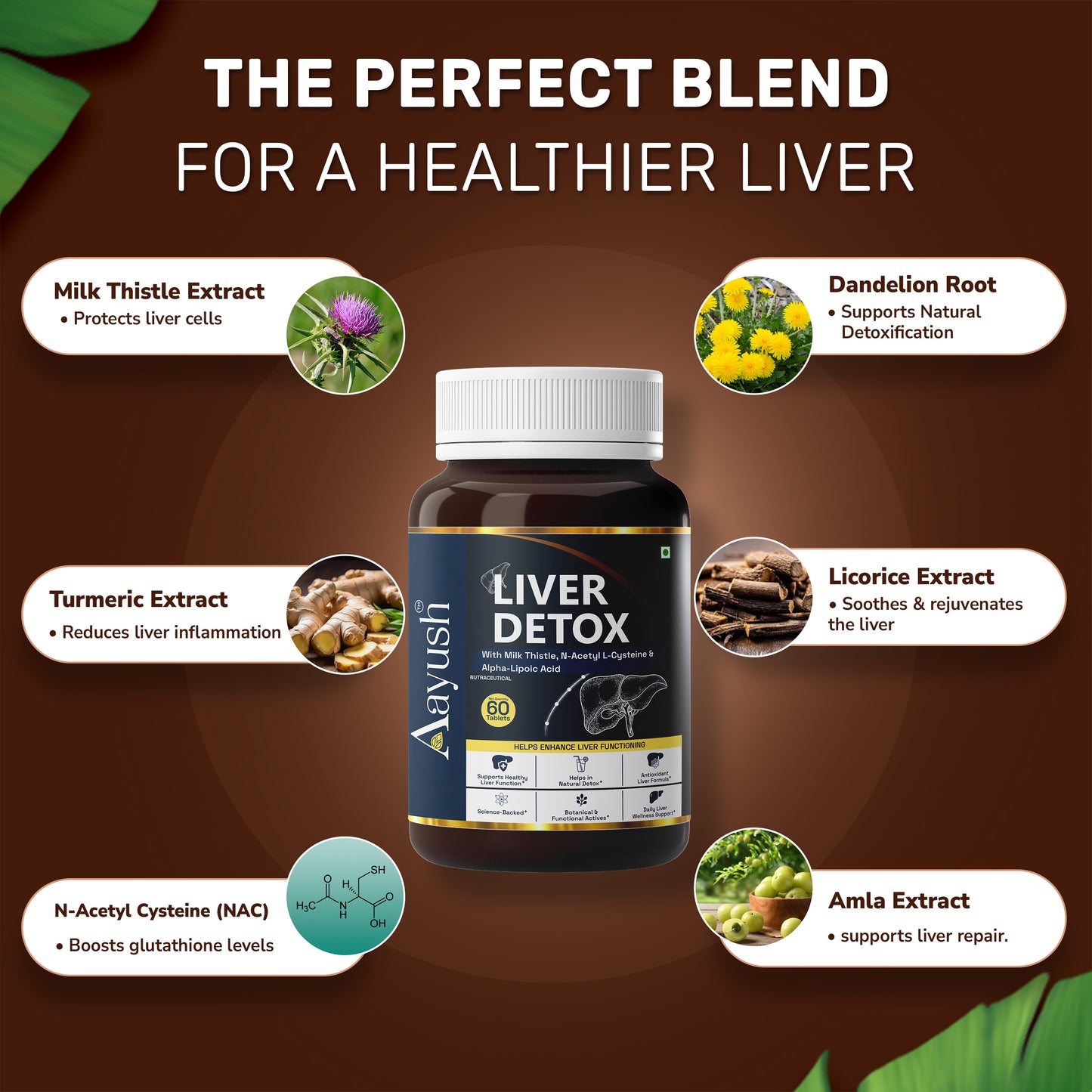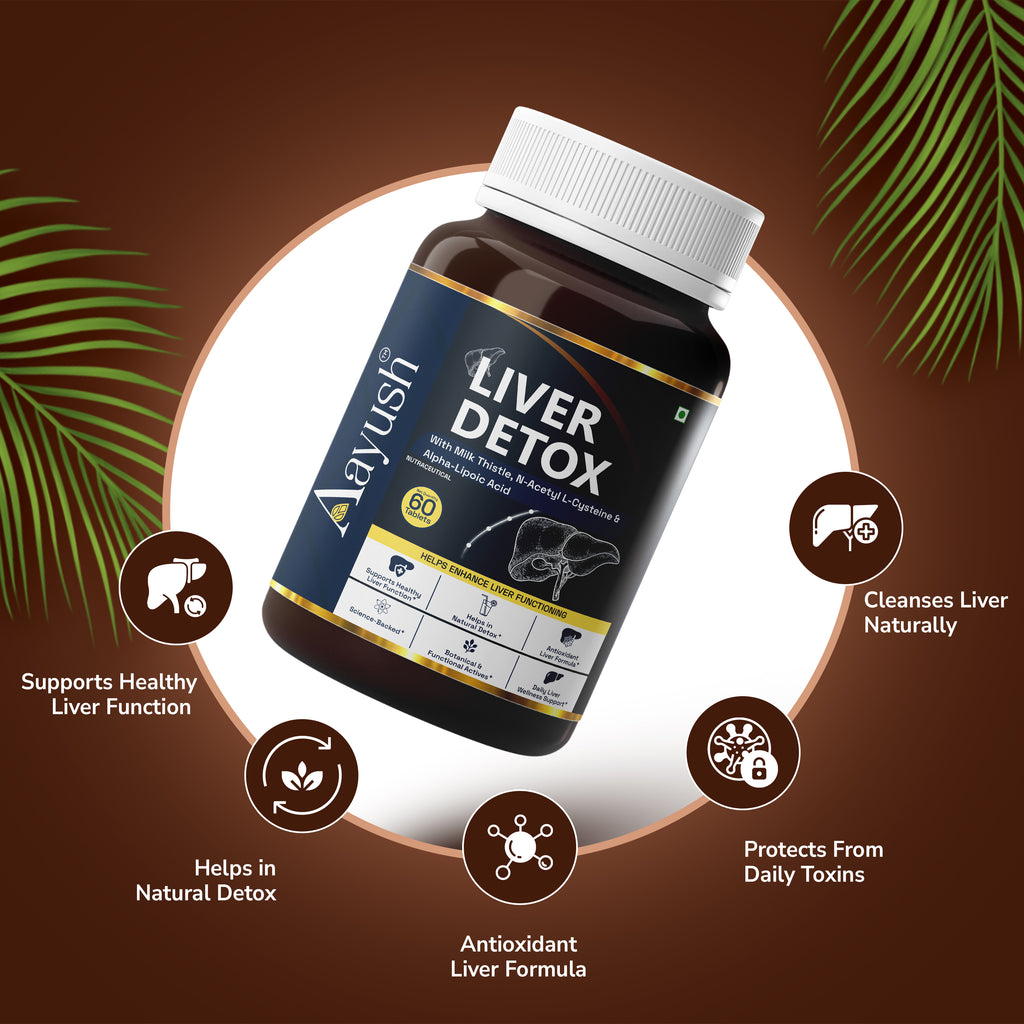 Aayush Liver Detox Tablets are nutraceutical supplements made with Milk Thistle, N‑Acetyl L‑Cysteine, Alpha‑Lipoic Acid, Turmeric, L‑Ornithine, L‑Carnitine, and L‑Glutamine to support liver health, natural detoxification, and antioxidant protection.