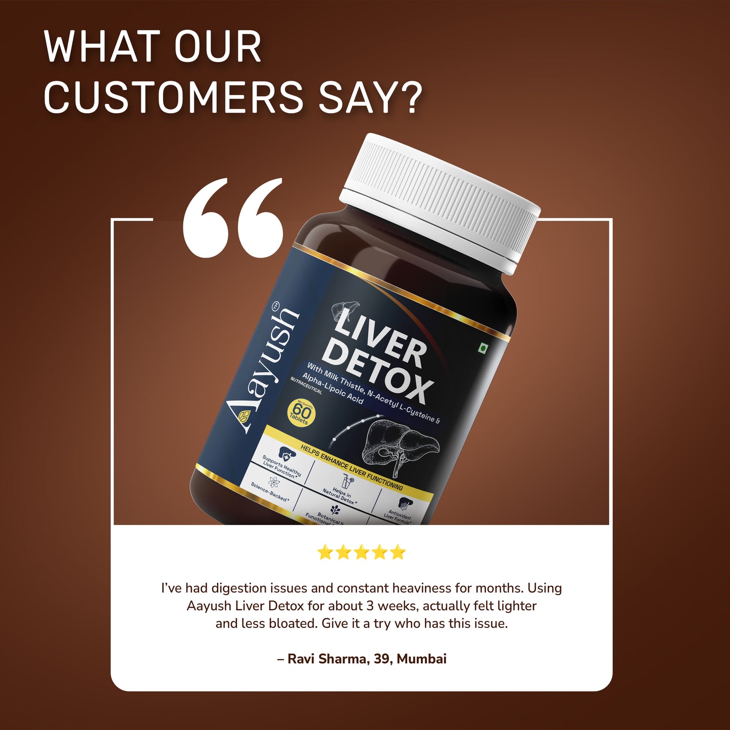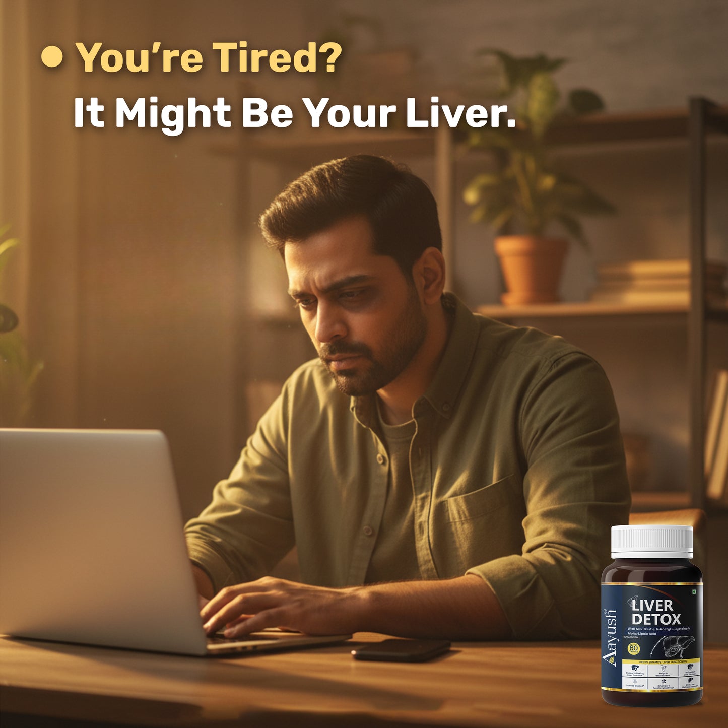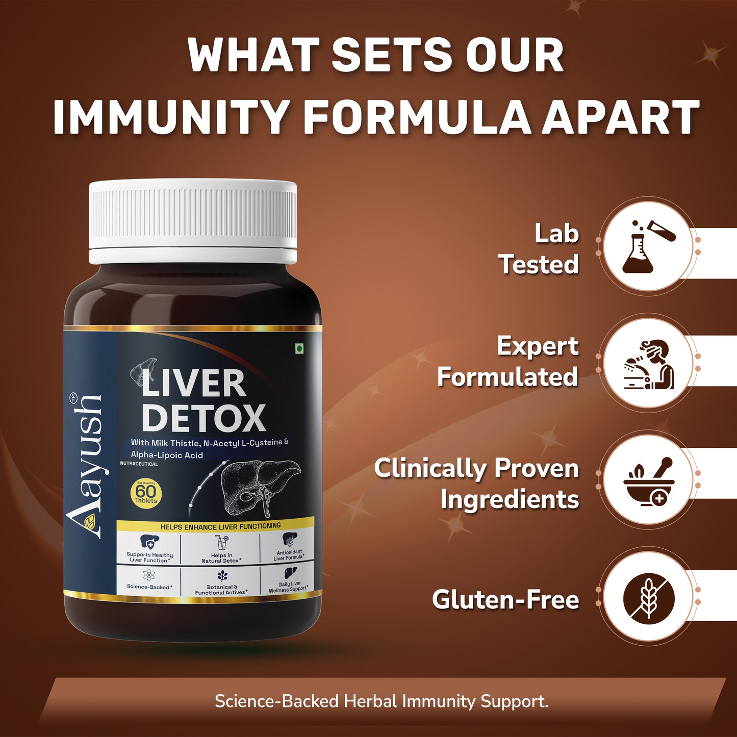 Aayush Liver Detox Tablets are nutraceutical supplements made with Milk Thistle, N‑Acetyl L‑Cysteine, Alpha‑Lipoic Acid, Turmeric, L‑Ornithine, L‑Carnitine, and L‑Glutamine to support liver health, natural detoxification, and antioxidant protection.